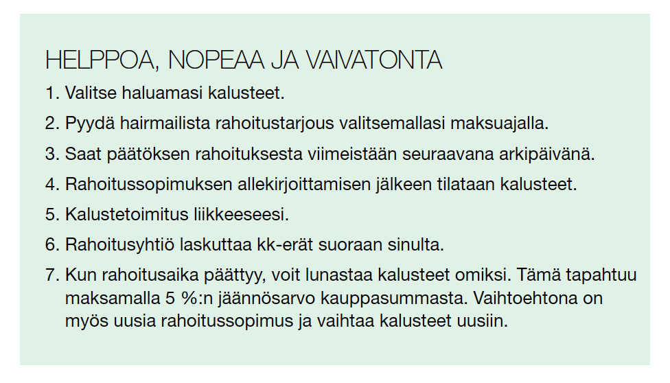 - Rahoitetut kalusteet ja laitteet toimivat pääasiallisena vakuutena, jolloin vakuutesi vapautuvat muuhun käyttöön yritystoimintasi kehittämiseen tai omaan elämiseesi.