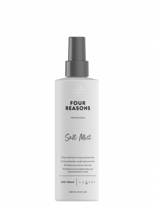 Suolasuihke antaa runsasta rakennetta, helpottaa hiusten muotoilua sekä korostaa kiharaa. Sopii hyvin niin sensuellin beach lookin luomiseen kuin pohjatuotteeksi esimerkiksi erilaisiin ponnareihin, letteihin ja nutturoihin. Rouheaa tekstuuria, häikäiseviä lopputuloksia! Four Reasons Professional Salt Mist on parhaista raaka-aineista luotu ammattilaislaatuinen tuote. Sen koostumus on vegaaninen ja pakkaus kierrätettävä.