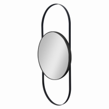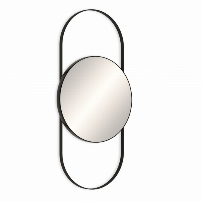 Minimalistinen asiakaspaikka, jossa on kiiltävän mustalla reunustettu pyöreä peili, kiinnitetty mattamustaan teräsovaaliin runkoon. Vaihtoehtoinen mattamusta hylly suoraan seinälle saatavilla pyynnöstä. Circolus luo asiakaspaikan, joka maksimoi kampaamon sisustussuunnitelman samalla säilyttäen jokaisen paikan erillisenä
