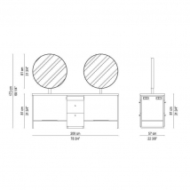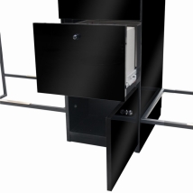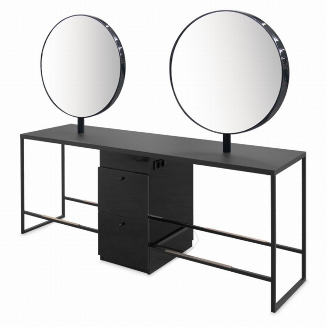 Neljänistuttava saarimallinen yksikkö jaettavalla säilytystilalla kummallakin puolella sekä 2 sähköpistoketta kullakin istuinpaikalla. Pöytätaso ja teräsrakenne mattamustassa viimeistelyssä, säilytysyksikkö ja peilin koristeet kiiltävässä mustassa viimeistelyssä. Integroitu jalkatuki ja jalkalevy messingistä. Aliarvostettu ratkaisu tilankäytön maksimoimiseksi salonkiympäristössä.