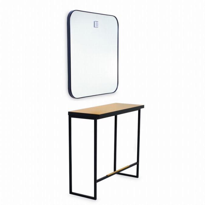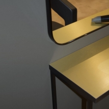 Vahvasti retrohenkinen asiakaspaikka. Yksinkertainen ja niin kaunis. Musta runko asiakaspöydässä, joka on mahdollista haluttaessa kiinnittää myös seinään. Pöytälevy helppohoitoista messingin hohtoista laminaattia. Peilin kehys viimeistelty kiiltävällä mustalla PVC:llä. Saatavissa samaan hintaan kullan värisellä peilillä.