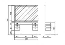 Asiakaspaikka parturiin näyttävällä suurella peilillä. Suuren työpinnan lisäksi asiakaspaikassa on neljä vedettävää laatikkoa ja kaksi pistorasiaa.