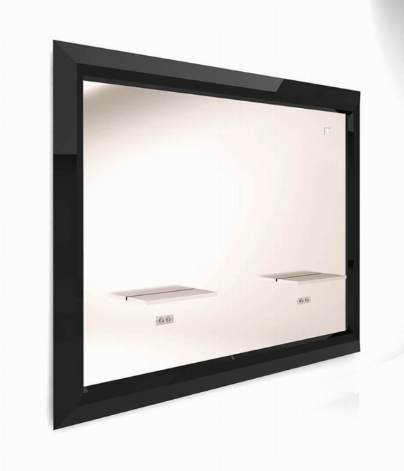 Seinään kiinnitettävä kahden hengen asiakaspaikka säästää tilaa. Kehys kiiltävää valkoista alumiinia ja hylly ruostumatonta terästä. Hyllyjen alla pistorasiat. Kehyksen voit valita minkä tahansa mieleisesi RAL-värikartan väreistä, esimerkkikuvassa RAL 9005 Jet black.
