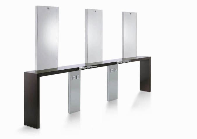 Kolmen hengen asiakaspaikka, johon voit itse valita mieleisesi laminaatin värin valikoimasta! Pöydän alatilan jakaa kaksi ruostumatonta terästä olevaa pylvästä, jossa on kaksi pistorasiaa. Tasossa on myös neljä alumiinista föönipidikettä.