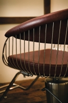 Kiinteä jalkatuki. Tuoli on elegantisti ja hennosti muotoiltu, mutta silti kestävästi suunniteltu.