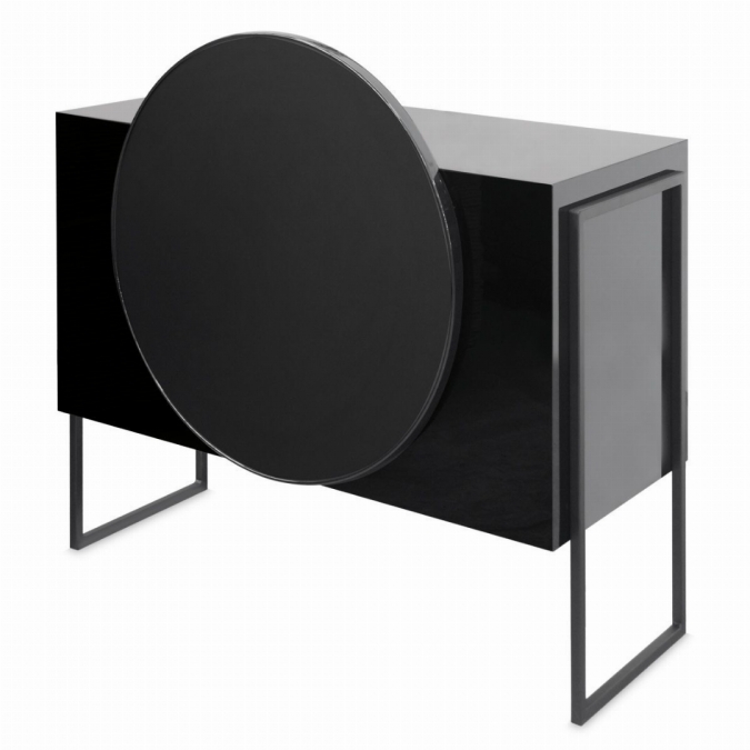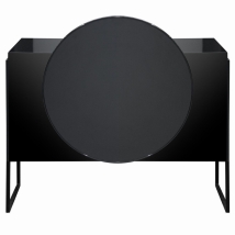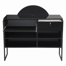 Vastaanottotiski kiiltävässä mustassa laminaatissa, jossa on mattamustat teräsjalat. Etuosan levy mattamustassa laminaatissa, ja levyn reunus kiiltävässä mustassa. Toimitetaan kaapeliliitännällä, hyllyillä ja lukittavalla laatikolla. Suunniteltu tekemään vaikutus, mutta pieneen tilaan sopivaksi, jalkojen leijuvan vaikutus korostaa tiskin eleganssia.