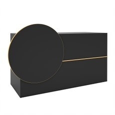 Vastaanottotiski valloittaa asiakkaasi heti heidän saapuessaan. Mattamusta kestävä melamiinirunko komeine messinkikehyksineen luo ylellistä tunnelmaa. Todella tyylitietoisen valinta! Hyvät säilytystilat lukittavine laatikoineen.