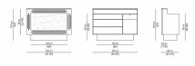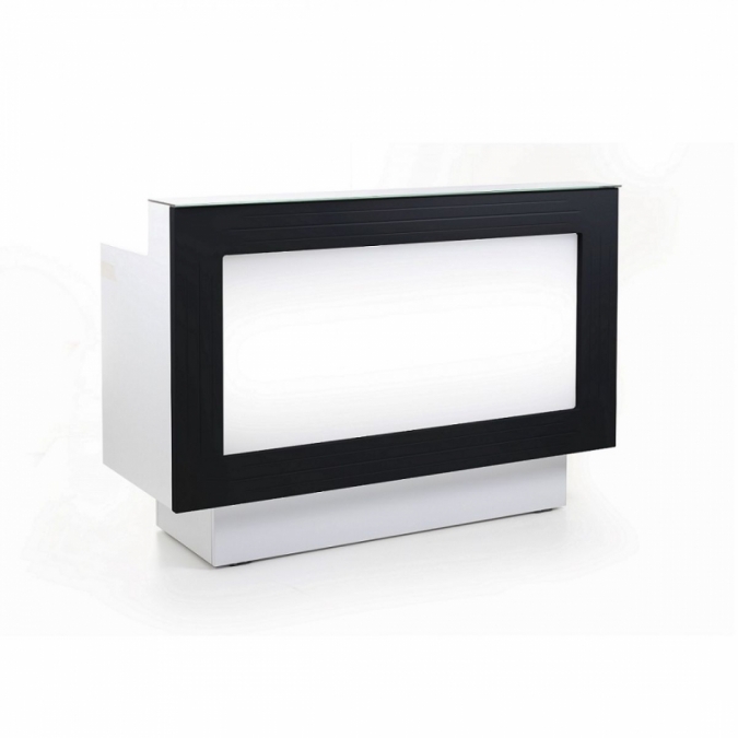 Mattavalkoinen melamiinista tehty vastaanottotiski. Edessä taustavalaistu pleksilasi mustalla kehyksellä, tiski mustaa lasia. Takana lukittava laatikko ja sisääntyönnettävä hylly.