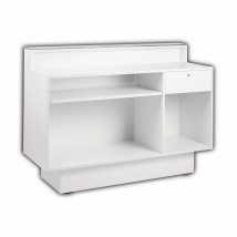 Mattavalkoinen melamiinista tehty vastaanottotiski. Edessä taustavalaistu pleksilasi mattavalkoisella kehyksellä, tiski valkoista lasia. Takana lukittava laatikko ja sisääntyönnettävä hylly.
