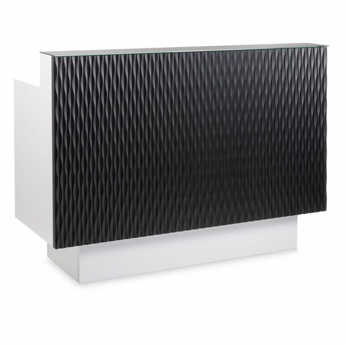 Vastaanottotiski mattamustaa melamiinia. Edessä mattamusta paneeli ja lasista tehty tiskipinta. Vastaanottotiskissä lukittava laatikko ja sisäänvedettävä hylly.