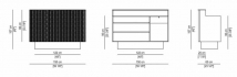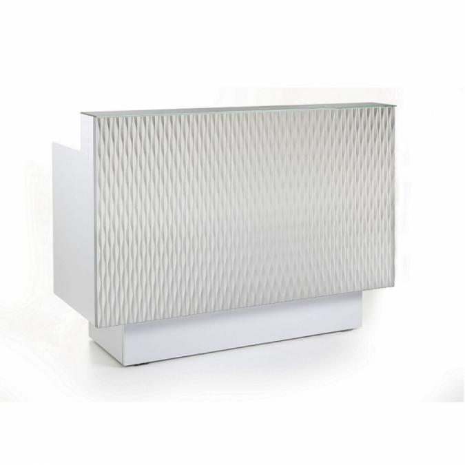 Vastaanottotiski mattavalkosta melamiinia. Edessä valkoinen paneeli ja lasista tehty tiskipinta. Vastaanottotiskissä lukittava laatikko ja sisäänvedettävä hylly.