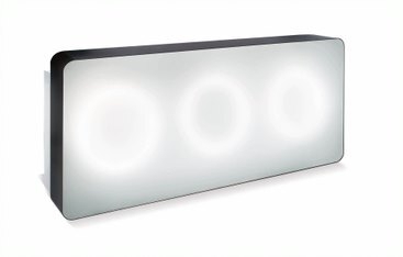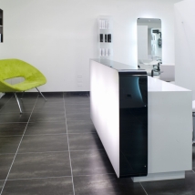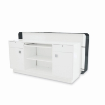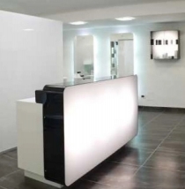 Retrohenkinen valaistu vastaanottotiski. Etupaneeli läpikuultavaa pleksilasia, työtaso valkoista melamiinilevyä. Kaksi lukittavaa kaappia ja ulos vedettävä näppäimistötaso.