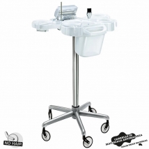 Tekninen kampaajan kärry, jossa on neljä irrotettavaa kulhoa, paikat kammalle ja harjoille sekä sisäänrakennettu folioleikkuri.
