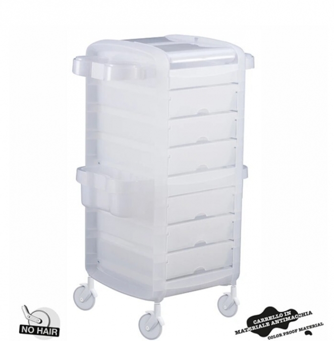 Mukana myös irrotettavat sivutuet, joihin voi sijoittaa kanistereita, pulloja, hiustenkuivaajia ja suoristusrautoja. Tämä kampaamokärry, joka on saatavilla useissa eri väreissä, on varustettu Ceriottin ainutlaatuisilla NO-HAIR- korkeilla pyörillä. Ne ovat ohuempia kuin tavalliset pyörät, mikä vähentää lattian kanssa kosketusta ja siten hiusten kertymistä, pitäen pyörät puhtaina ja tehokkaina.