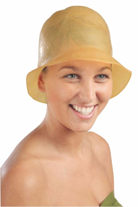 Perinteinen ruskea luonnonkumihuppu on klassikkotuote. Sen voi muokata monen kokoiseen päähän käytännöllisen lierin avulla. Lieri estää myös väriaineiden valumisen. Valmiita reikiä on riittävästi perusraidoitukseen.