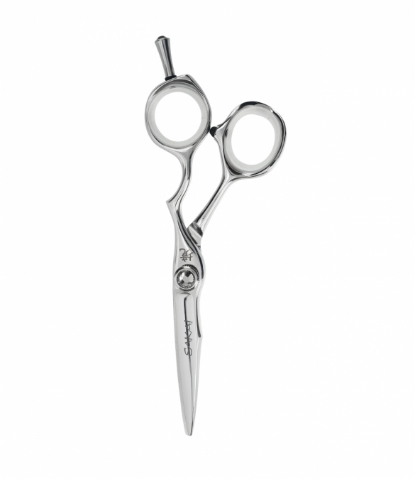 Upean näyttävät puoliergonomiset Sakai Luxury First Class sakset leikkaavat veitsenterävästi ja tarkasti. Saksien kiristysruuvissa on upea savunharmaa kristallikivi, joka kruunaa tyylikkään ja toimivan kokonaisuuden.