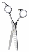 TS-6028 muotoilusaksissa on kaarevat hampaat joka helpottaa leikkautumattomien hiusten liukumista. Hammastetun terän hampaan pää on erikoishiottu kolmeen tasoon. Joka toinen hammas on ohuempi, mikä parantaa leikattavuutta sekä tekee lopputuloksesta siistin. Näillä erikoismuotoilusaksella saat hyvän ja ilmavan leikkaustuloksen.