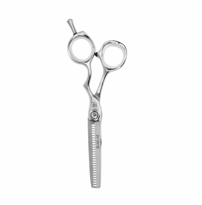 Sakai Luxury First Class muotoilusakset ovat ulkomuodolta näyttävät ja ominaisuuksiltaan laadukkaat. Terä leikkaa veitsenterävästi ja tarkasti. Puoliergonominen muotoilu istuu hyvin käteen. Saksien kiristysruuvissa on upea savunharmaa kristallikivi, joka kruunaa tyylikkään kokonaisuuden.