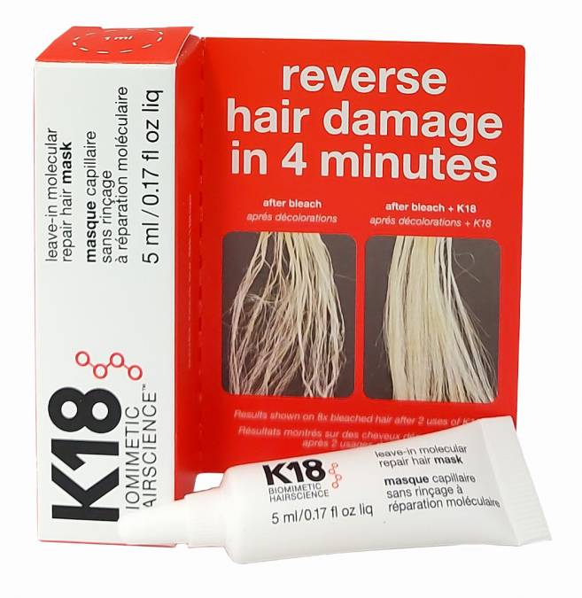 Vaalennus, värjäys ja muut kemialliset käsittelyt rikkovat keratiiniketjuja. Patentoitu K18 ei ole vain väliaikainen korjauskeino - se on ensimmäinen tuote, joka hyödyntää biomimetiikkaa rakentamaan keratiiniketjut uudelleen. Tuloksena pehmeät, sileät, vahvat ja kimmoisat hiukset. Mitä vaurioituneemmat hiukset ovat, sitä dramaattisempi lopputulos.