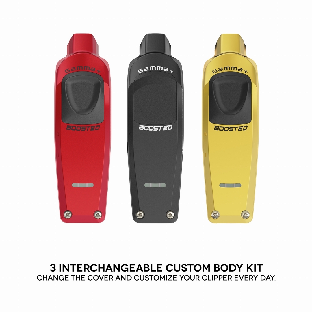 Boosted Trimmer toimitetaan kolmella vaihdettavalla kuorella (musta, punainen, kulta), joten voit vaihtaa laitteen ulkonäköä helposti tilanteen ja tyylin mukaan. Voit valita sopiiko omaan käteen parhaiten tasainen vai peukalonpaikalla oleva kuori. Trimmerin alapuolella on ergonominen muotoilu muille sormille.