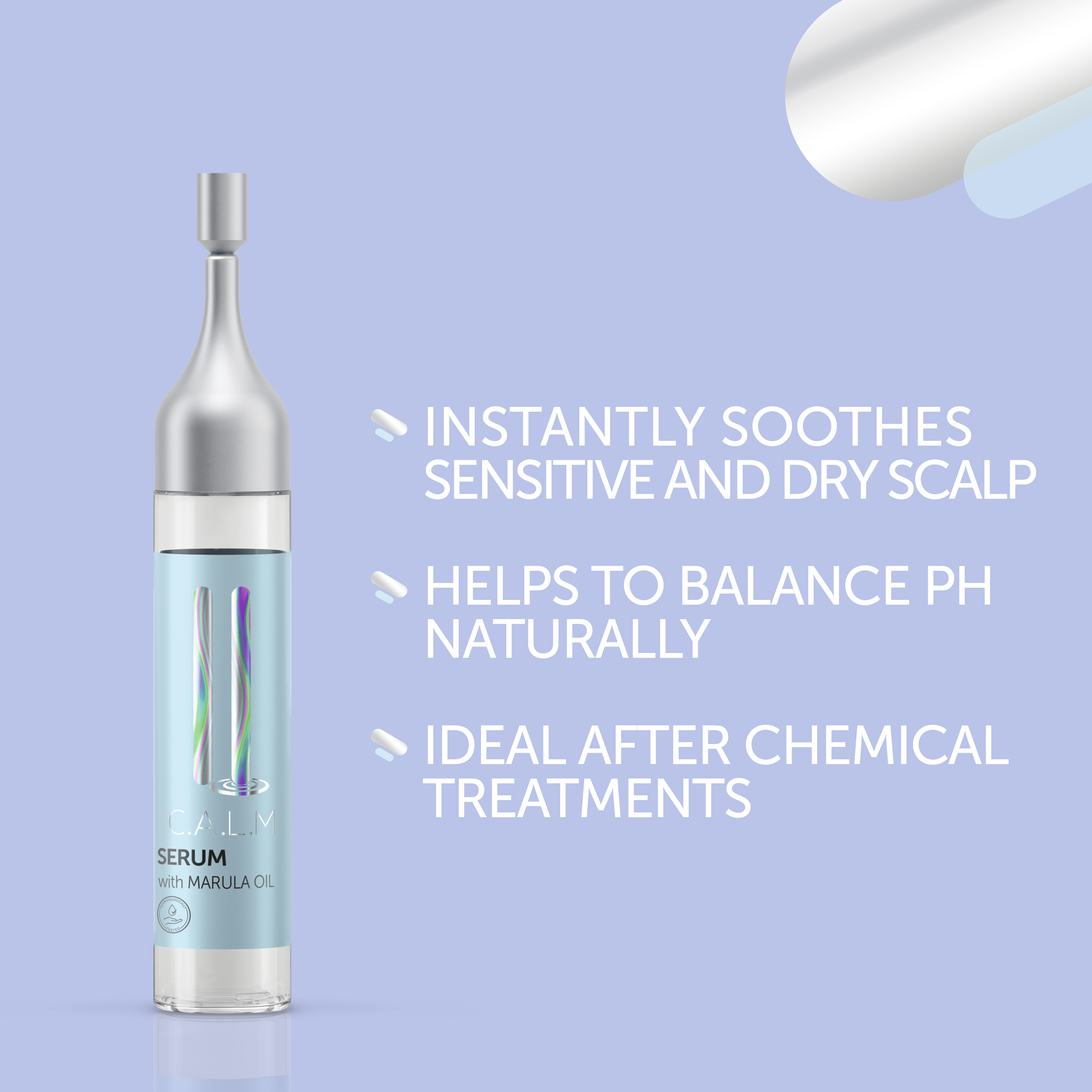Hiuspohjaa ravitseva hoitoseerumi. Hellävaraisesti hiuspohjaa rauhoittava ja tasapainottava. Lievittää ärtynyttä, herkkää ja kuivaa hiuspohjaa ensimmäisestä käytöstä alkaen.* Auttaa tasapainottamaan ihon luonnollista pH:ta. Ihanteellinen kemiallisten käsittelyjen jälkeen. Sisältää Marula-öljyä, Pantenolia ja Betaiinia. Vegaaninen koostumus. Ei silikoneja. Käyttö: Levitä tasaisesti puhtaalle hiuspohjalle. Hiero hellävaraisesti. Älä huuhtele. *kun käytetään yhdessä C.A.L.M. Shampoon ja Hoitoaineen kanssa.