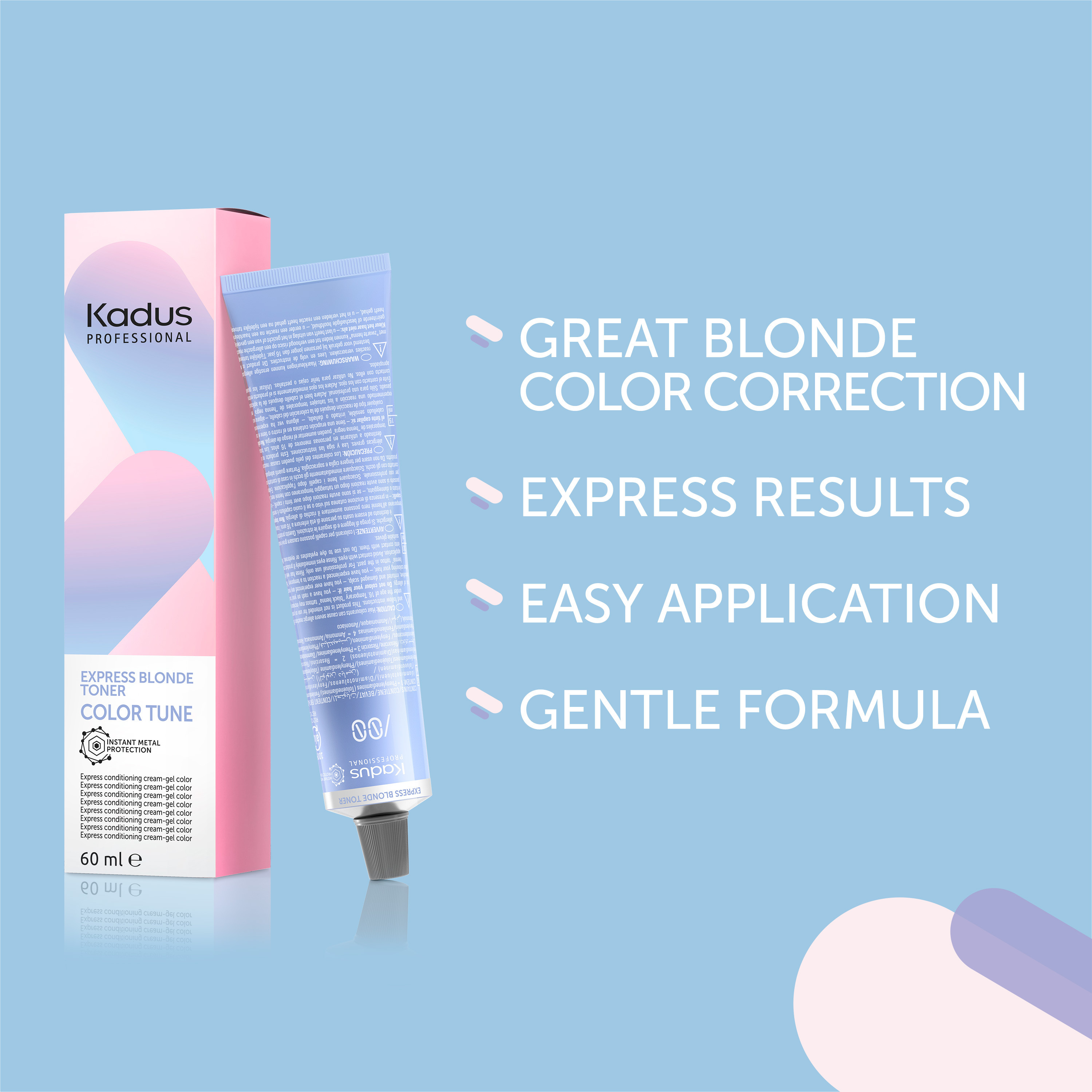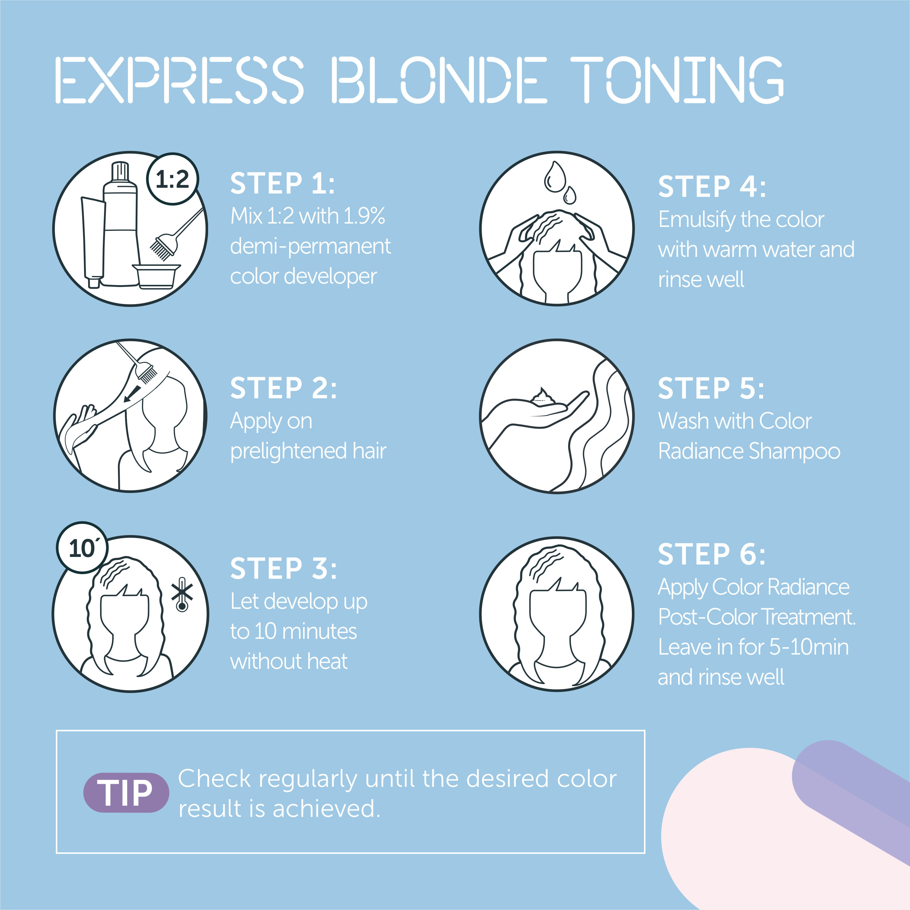Sävyt, jotka ovat suunniteltu täydellisten vaaleiden hiusten värjäyksiin! Color Tune Express Blonde Tonerilla! Blonde Tonereilla luot täydellisen ja varman vaalean lopputuloksen ja intensiivisen kiillon. Saatavilla 6 toisiinsa sekoitettavaa sävyä – rajattomasti sävymahdollisuuksia.
