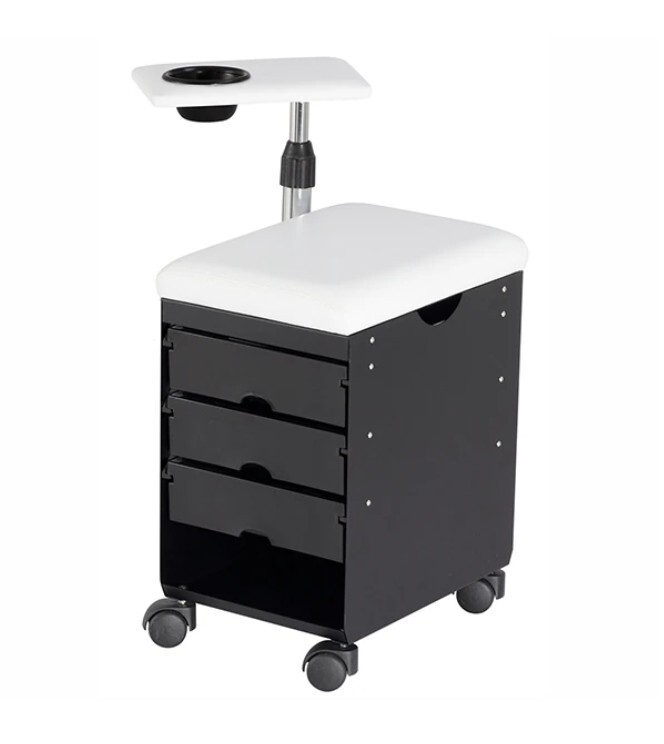 Cube Manicure on metallinen kauneuskärry, jossa on kolme liukuvaa ja irrotettavaa laatikkoa. Kärry sisältää pehmustetun istuimen, jonka verhoilun voi valita mieleisekseen, sekä korkeussäädettävän käsituen.