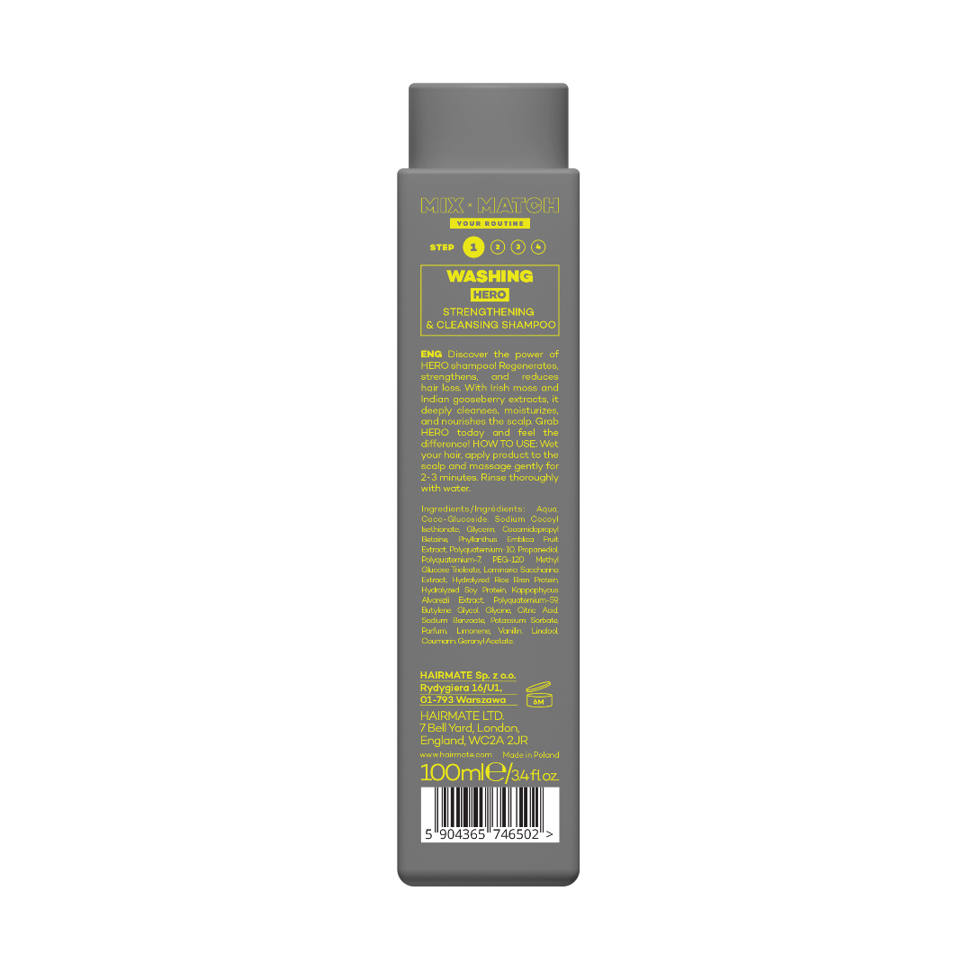 Tutustu HERO-shampoon voimaan! Se hoitaa hiuspohjaa, vahvistaa hiuksia ja vähentää hiustenlähtöä. Uyaku-juuriuutteeseen ja irlanninsammaleeseen perustuva koostumus uudistaa, kosteuttaa ja lisää hiuksiin kiiltoa. Käytä päivittäin tai vuorottele toisen shampoon kanssa – mikä ikinä sopii sinulle parhaiten. Valitse HERO jo tänään ja koe ero.