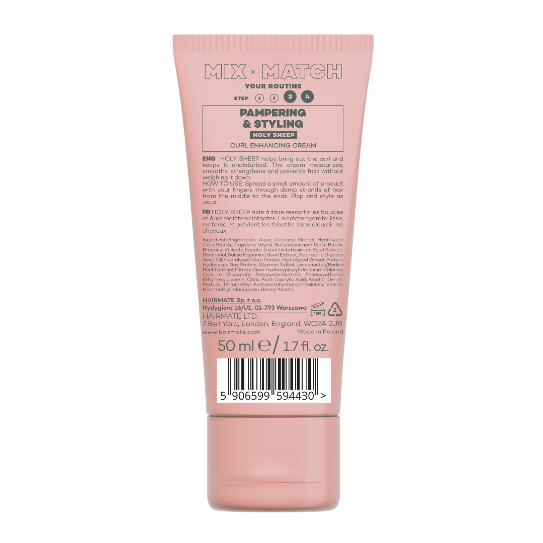 HOLY SHEEP auttaa korostamaan kiharoita ja kesyttämään kiharaiset hiukset. Se kosteuttaa ja ehkäisee pörröisyyttä. Huolellisesti valitut ainesosat silottavat hiuksia latistamatta niitä ja suojaavat vaurioilta, kun taas vegaaniset proteiinit vahvistavat hiuksia.