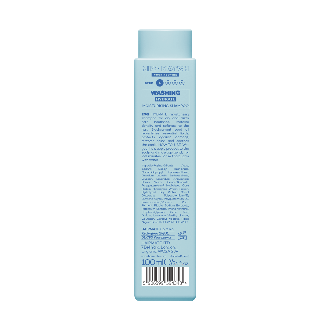 HYDRATE-shampoo on suunniteltu luonnostaan kuiville ja vaurioituneille hiuksille, jotka ovat taipuvaisia pörröisyyteen ja joilla on keskikorkea tai korkea huokoisuus. Hoitavien aineiden ja aktiivisten ainesosien runsaus auttaa palauttamaan hiuksiin kiiltoa. Mustaherukkaöljyn ansiosta hiuksesi saavat takaisin välttämättömiä lipidejä, kun taas laventelihydrolaatti, jolla on virkistäviä ja antiseptisiä ominaisuuksia, rauhoittaa hiuspohjaa. HYDRATE:n käyttö kosteuttaa, ravitsee, suojaa lisävaurioilta ja palauttaa hiusten tuuheuden ja pehmeyden.