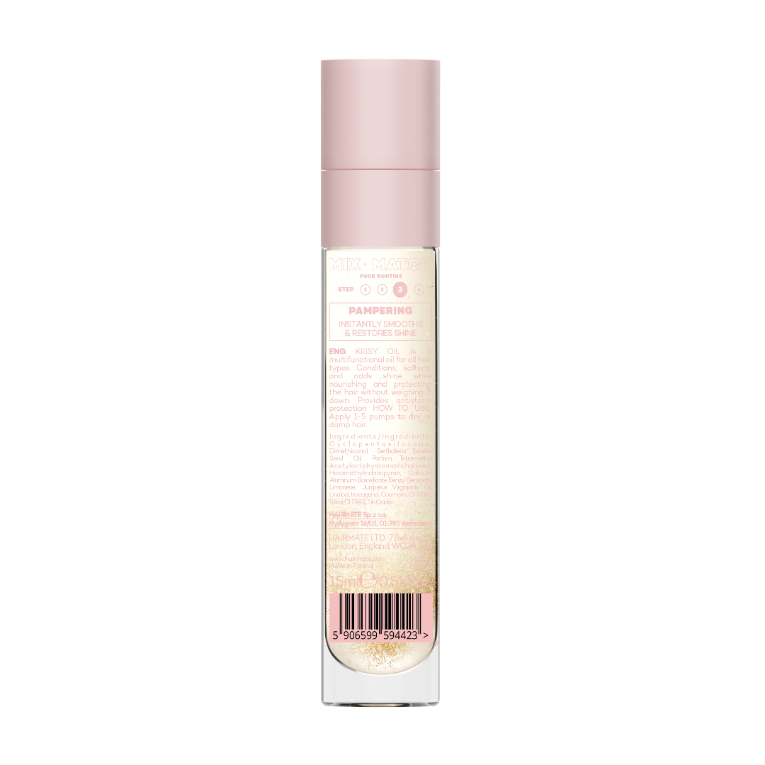 KISSY OIL toimii ravitsevana seerumina pörröisille ja vaikeasti hallittaville hiuksille. Brasilianpähkinäöljy tarjoaa erinomaisen hoidon, lisää joustavuutta ja antaa hiuksille kiiltoa. KISSY OIL ravitsee hiuksia latistamatta niitä, jättäen hiukset elinvoimaisiksi. Öljy sisältää antistaattisia ominaisuuksia.