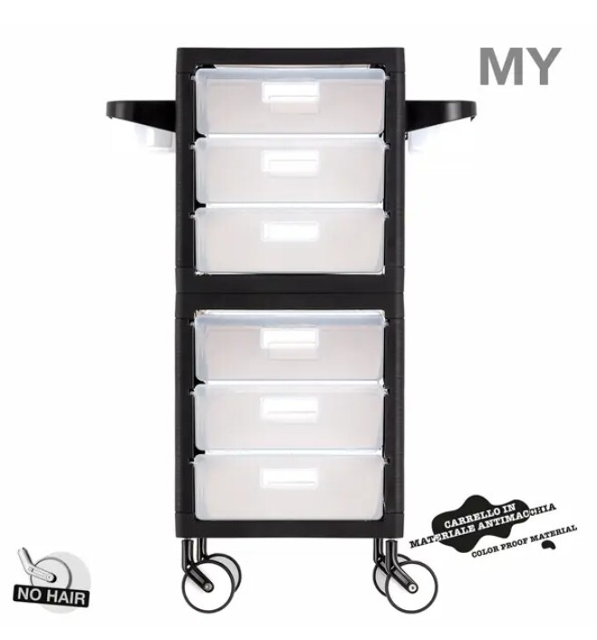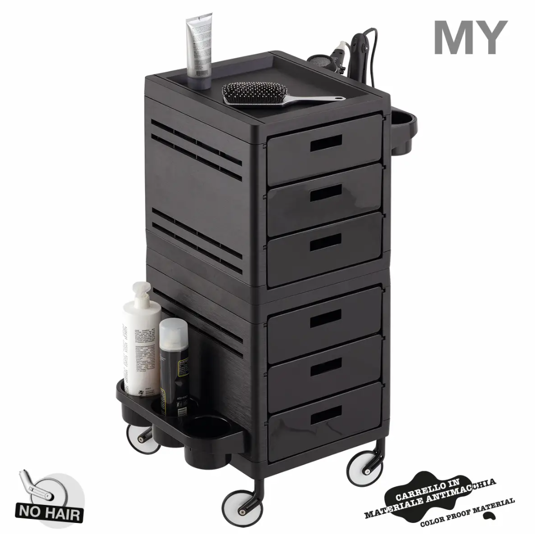 Laadukas My 6 työtarvikevaunu on tyylikästä italialaista designia. Upeat värit ja klassinen muotoilu tekevät My 6-sta näyttävän tarvikevaunun liikkeeseesi. Kestävää ja likaa hylkivää materiaalia. Tilavissa laatikoissa säilytät tarvikkeet hyvässä järjestyksessä. Umpinainen runko suojaa tarvikkeita pölyyntymiseltä. Tarviketelineet voit asentaa kummankin puolen haluamallesi kohdalle. Helppo liikutella suurten pyörien ansiosta.