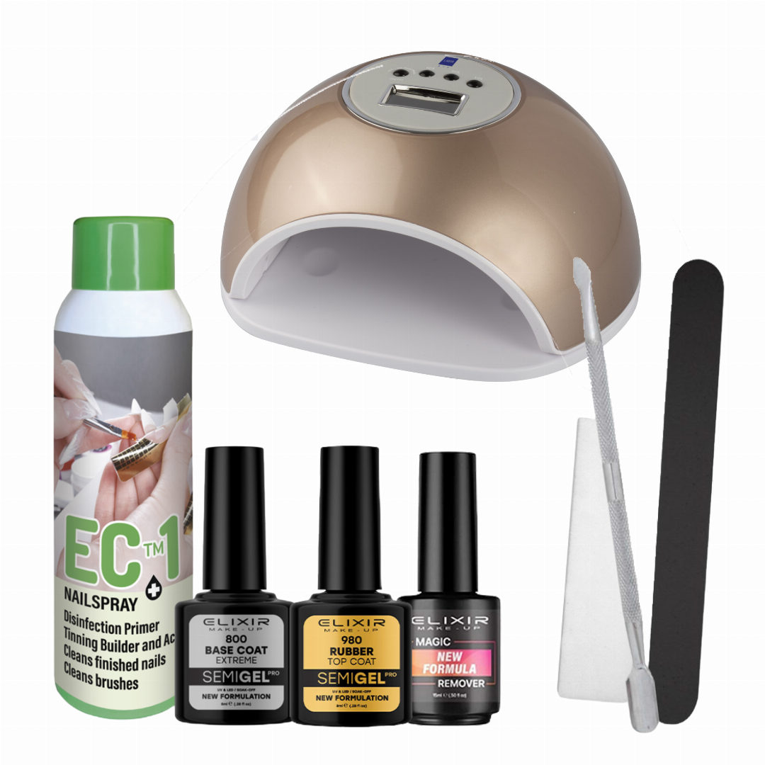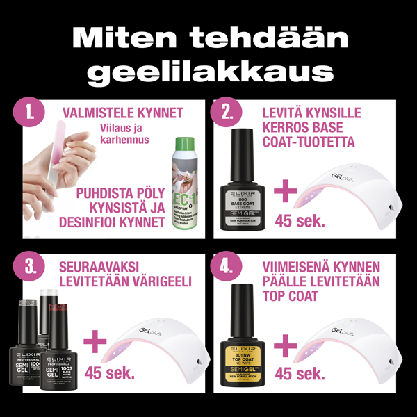 Semi Gel on ammattilaiselle suunniteltu tuote. Laadukas geeli, joka on helppo levittää. Semi Gel värinpitävyys on kolmesta viikosta kuukauteen. Geeli kovettuu UV-lampussa 2 minuutissa tai LED-lampussa 45 sekunnissa.