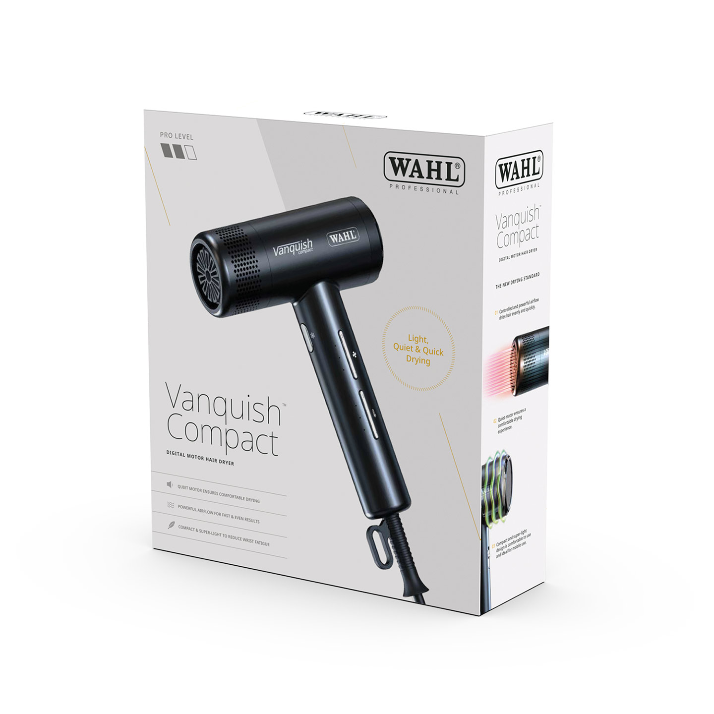 Wahl Vanquish™ Compact vie hiustenkuivauksen uudelle tasolle. Tehokas ja hallittu ilmavirtaus yhdistettynä huippunopeaan digitaalimoottoriin takaa nopean ja tasaisen kuivauksen – ammattilaisen vaatimusten mukaisesti. Hiljainen moottori varmistaa miellyttävän työskentelykokemuksen, sinulle ja asiakkaallesi. Kompakti ja erittäin kevyt rakenne vähentää ranteen rasitusta pitkässäkin työpäivässä. Ioniteknologia ehkäisee hiusten sähköistymistä ja lisää kiiltoa. Älykäs Auto Clean -toiminto helpottaa päivittäistä huoltoa.