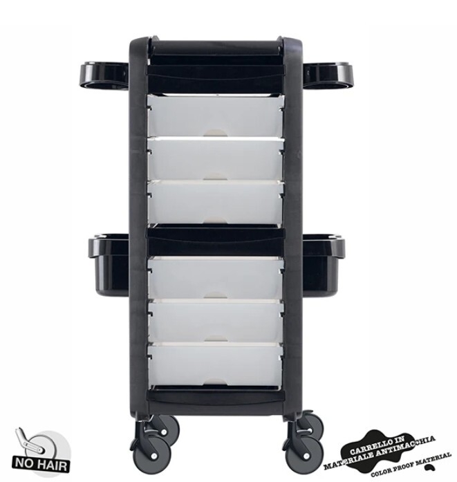 Mukana myös irrotettavat sivutuet, joihin voi sijoittaa kanistereita, pulloja, hiustenkuivaajia ja suoristusrautoja. Tämä kampaamokärry, joka on saatavilla useissa eri väreissä, on varustettu Ceriottin ainutlaatuisilla NO-HAIR- korkeilla pyörillä. Ne ovat ohuempia kuin tavalliset pyörät, mikä vähentää lattian kanssa kosketusta ja siten hiusten kertymistä, pitäen pyörät puhtaina ja tehokkaina.