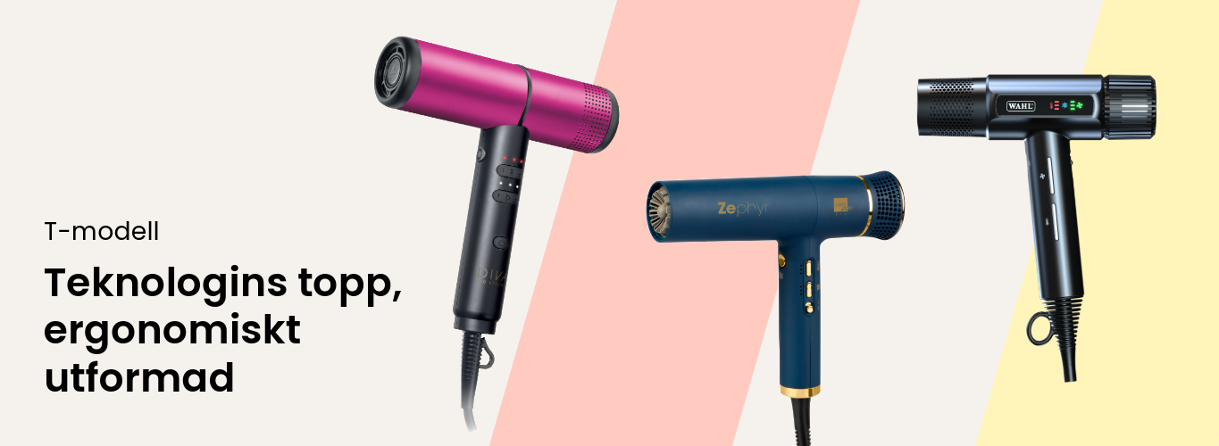 En T-formad fön representerar en ny generation inom hårtorkteknik: motorn placeras i handtaget, vilket fördelar vikten mot handen och gör hela enheten lättare. Resultatet är en välbalanserad, tyst och kraftfull fön – designad för professionellt bruk.