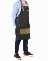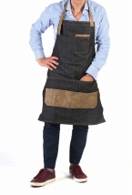 En professionell frisersalong är hållbar och bekväm. Tillverkad av denimtyg i gammal amerikansk stil och avslutad med ekologiskt läder. Den har en justerbar halsögla och midja. Två fickor för verktyg.