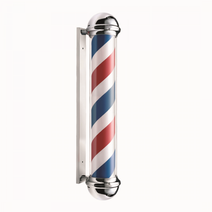 Väck salongens fasad till liv! Den legendariska roterande Barber Pole med blåröda ränder drar garanterat blickarna till sig! Monteringsdelen är av rostfritt stål, topparna av krom och den roterande delen av hållbar akrylplast. Lämplig för både inomhus- och utomhusbruk (stickkontakten och brytaren ska installeras inomhus).