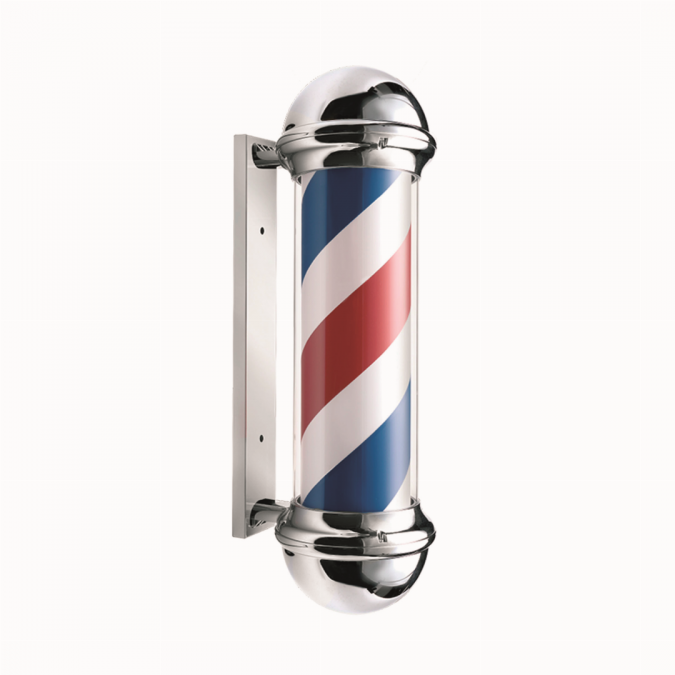 Väck salongens fasad till liv! Den legendariska roterande Barber Pole med blåröda ränder drar garanterat blickarna till sig! Monteringsdelen är av rostfritt stål, topparna av krom och den roterande delen av hållbar akrylplast.