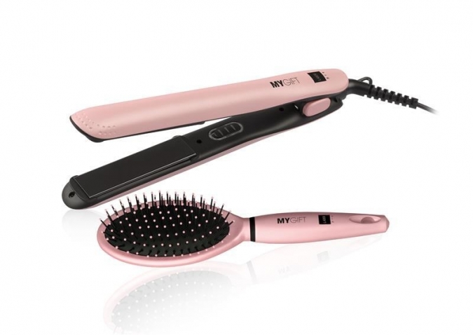 Prisvärd och iögonfallande – MY GIFT-setet som förtjänar en plats i din salongs butikshylla. Det stilfulla och prisvärda MY GIFT-setet är en utmärkt produkt att erbjuda dina kunder – en perfekt gåva eller ett lyxigt hemmakit för egenvård. Förpackningen innehåller en högkvalitativ tourmaline-plattång och en mjuk borste i rosa nyans, som tillsammans skapar en komplett stylingupplevelse.