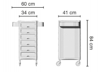 Kolonnformad skönhetsvagn med möjlighet till sex lådor, alla utdragbara, utbytbara och utrustade med interna avdelare. Vagnen har även sidostöd för hårtorkar och plattänger samt fack för flaskor och tillbehör