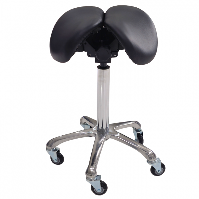 I den tvådelade sitsen i sadelstolen Win fördelas vikten på sittbenen, vilket minimerar trycket i grenen. Den tvådelade sitsen är särskilt bra för män. Den förbättrar luftcirkulationen, vilket gör att man inte svettas och består av äkta skinn som andas och är behaglig att använda.