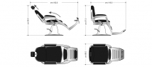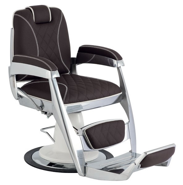 Stommen, fotstödet och armstödet i denna fantastiska barberarstol är av polerat aluminium. Ryggstödet, sitsen, armstöden och fotstödet är stoppade med polyuretanskum. Välj önskad klädsel ur Ceriottis breda sortiment. Nackstödet är justerbart och kan vid behov även tas loss. Den mekaniskt synkroniserade lutningsmekanismen gör stolen otroligt hållbar. Hydraulisk pump och broms.