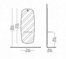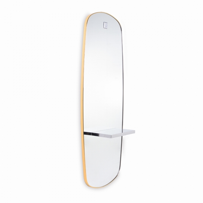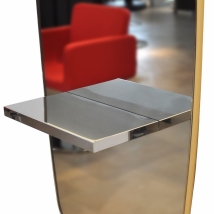 Enkel och elegant kundspegel med hylla av rostfritt stål. Ram av mässingfärgad PVC. Finns även med svart ram till samma pris.