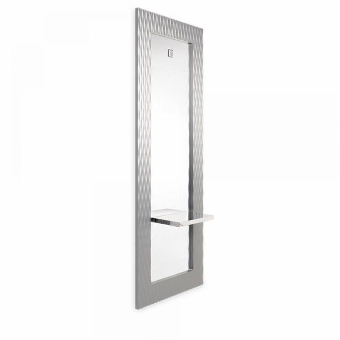 Det eleganta vågmönstret i spegelns ram får denna kundplats att sticka ut lite extra. Hylla av rostfritt stål. Spegelramen är gjuten i ett stycke av svart MDF och har inga skarvar som samlar damm. I