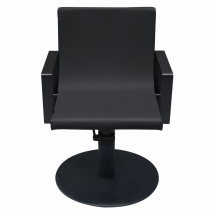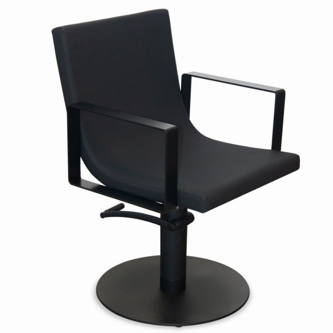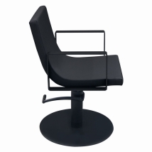 Klädd kundstol med mattsvarta metallarmar på en mattsvart rund stålbas med 360° sväng och hydraulisk, låsbar pump. Stylingstolen Iron Black placerar kunden i en upprätt position samtidigt som det finns utrymme för sidorörelser. Metallarmarna tillåter kunden att ändra position över tiden och förbli bekväm.