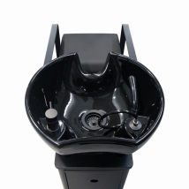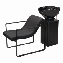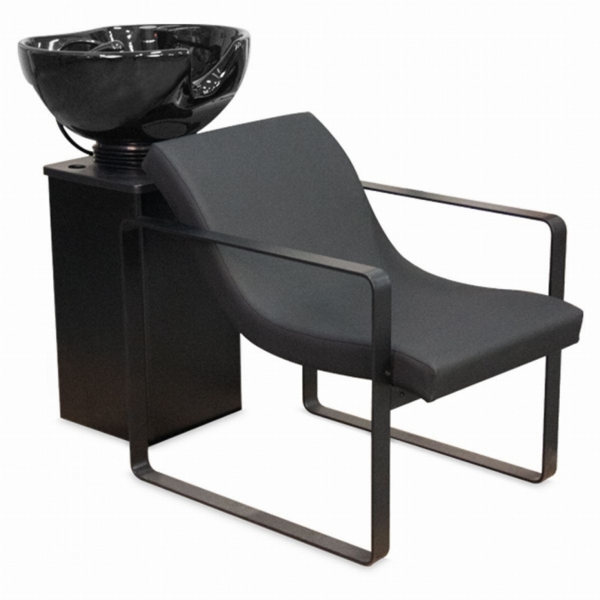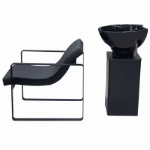 Ensitsad tvättstol med svart stål tvättkolonn utrustad med svart ergonomisk vinklingsbar keramiktvätt, svart blandare, svart handdusch och avloppsfälla. Stol i lutande position med mattsvarta stålarmstöd oberoende av kolonnen för att underlätta anpassning till användarens storlek och rengöring. Perfekt för salongen med hög omsättning vid tvättplatsen som söker en praktisk, enkel lösning.