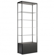 Vitrinskåp med svart stålstomme, glashyllor och LED-belysning. Förvaringsskåp i svart melamin T42, med låda.Leveranstid ca 4-5 veckor.